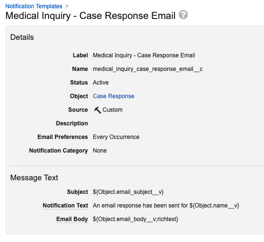 - The Medical Inquiry Case Response Cover Letter references the Case, Case Request and Case Response object records.