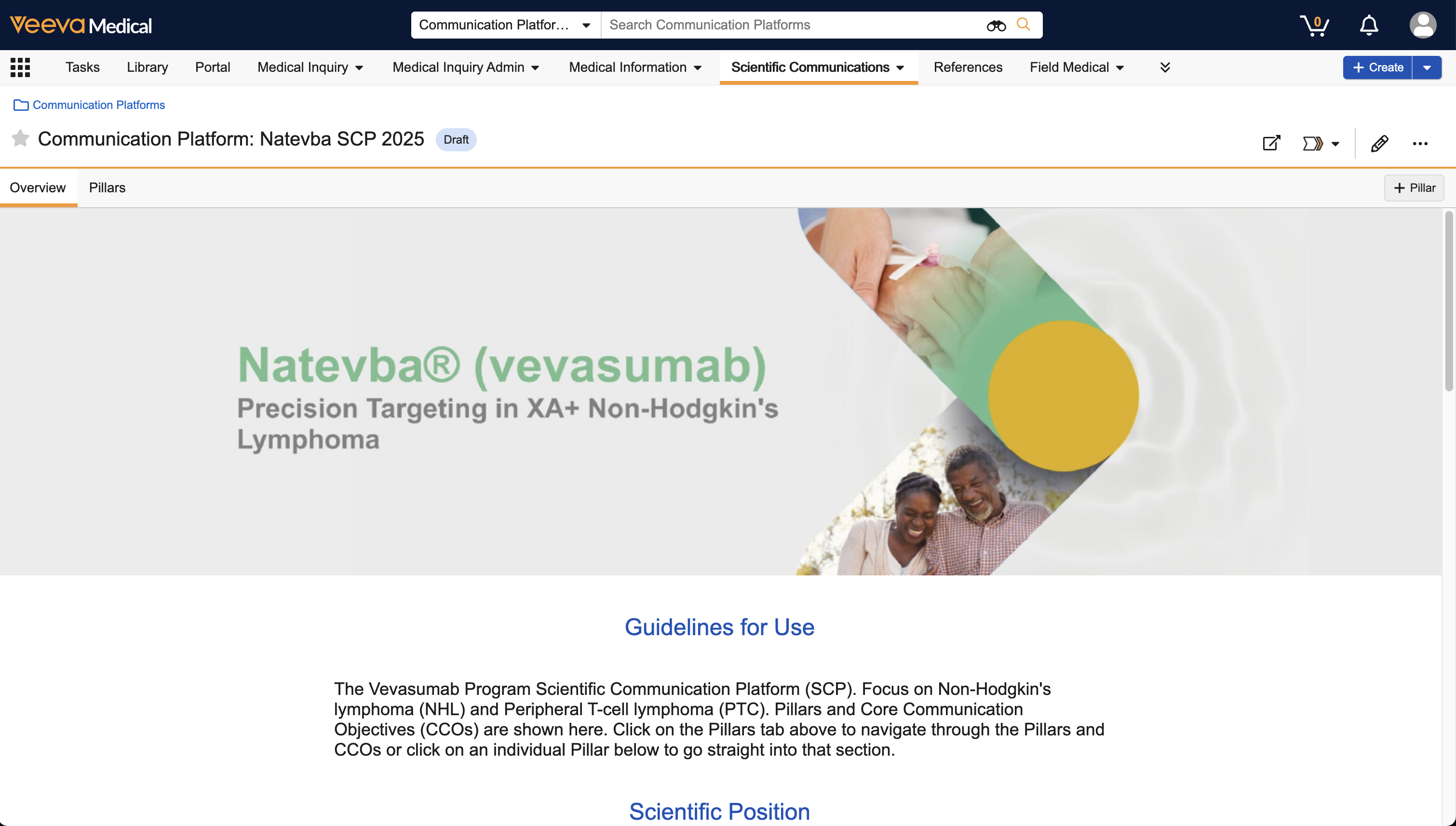 - Overview: This tab displays any defined Hero Image, Guidelines for Use, Pillars, and Scientific Positions.